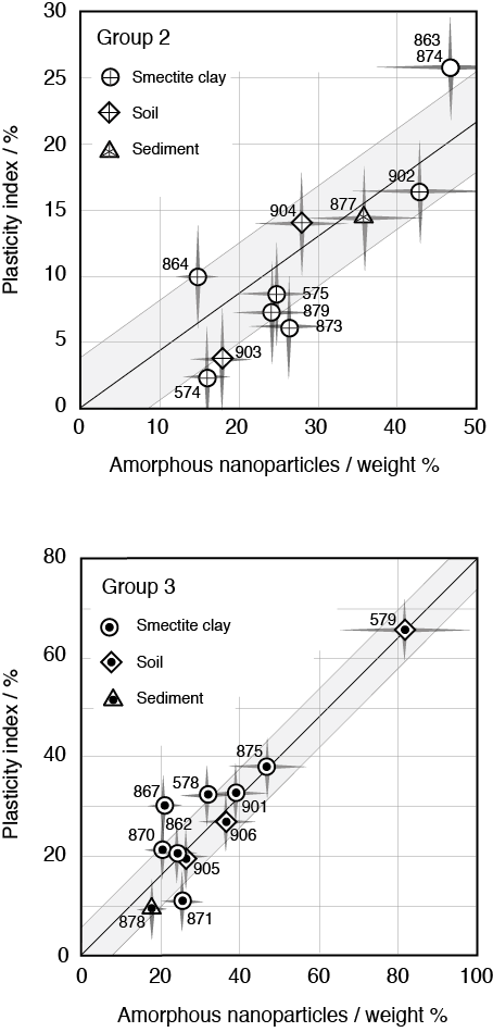 図は、非晶質ナノ粒子の量と可塑性因子が比例していることを表しています。つまり、粘土の可塑性の原因は、層状ケイ酸塩粘土鉱物ではなく、非晶質ナノ粒子なのです。
